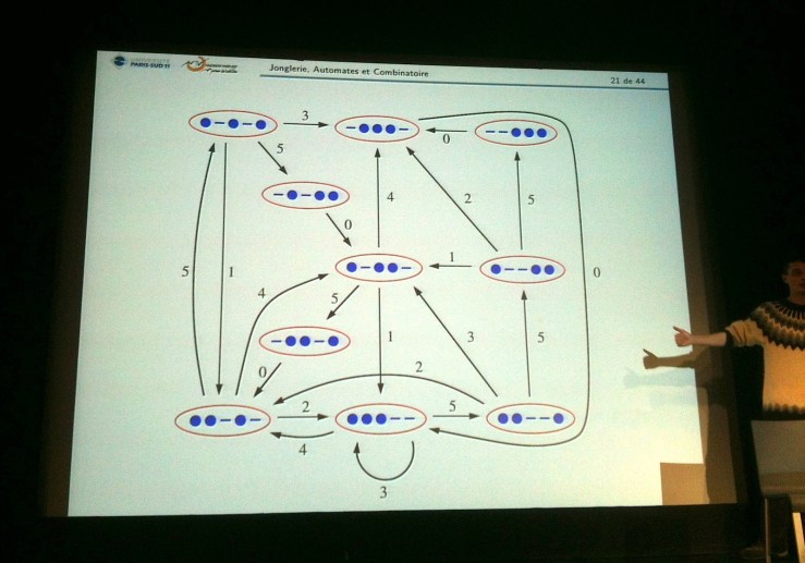 The seminar (whose usual themes include “Systèmes évolutifs à mémoire”, or “Langages synchrones”) began at 2.30pm with a lecture from Jean-Christophe Novelli and Florent Hivert, of the Université Paris-Est Marne-la-Vallée and the Université Paris-Sud. After a general introduction to juggling theory they jumped quite quickly into the deeper mathematics lurking behind, in the form of combinatorics. This was clearly a lecture by mathematicians with an interest in juggling, rather than the other way round, and that was to be the feel of most of the rest of the day.